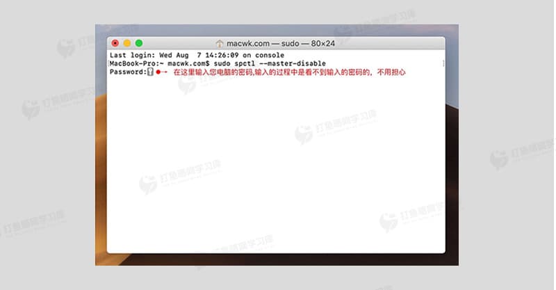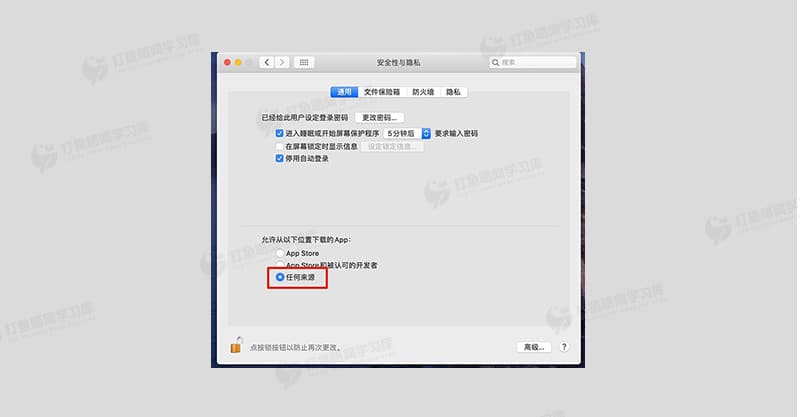 3. 若没有「任何来源」选项,打开终端输入命令`sudo spctl –master-disable`,按回车后输入电脑解锁密码(输入时不显示),再次回车,返回设置页面即可看到并勾选该选项。