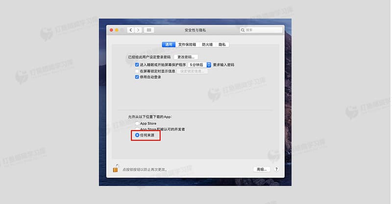 5. 回到「安全与隐私 》 通用」页面,即可看到「任何来源」选项,命令执行后一般会默认选中,未选中则解锁后勾选即可。